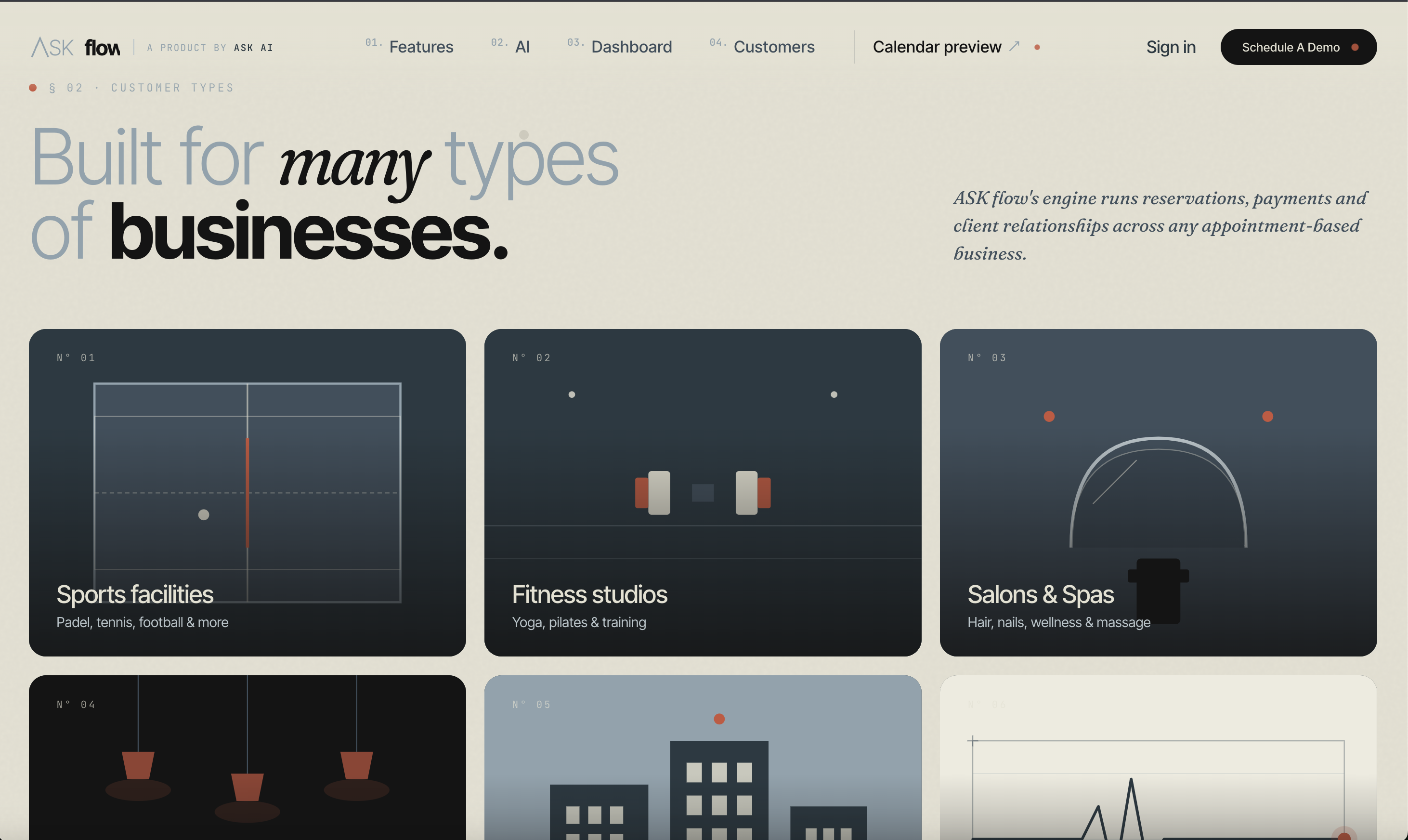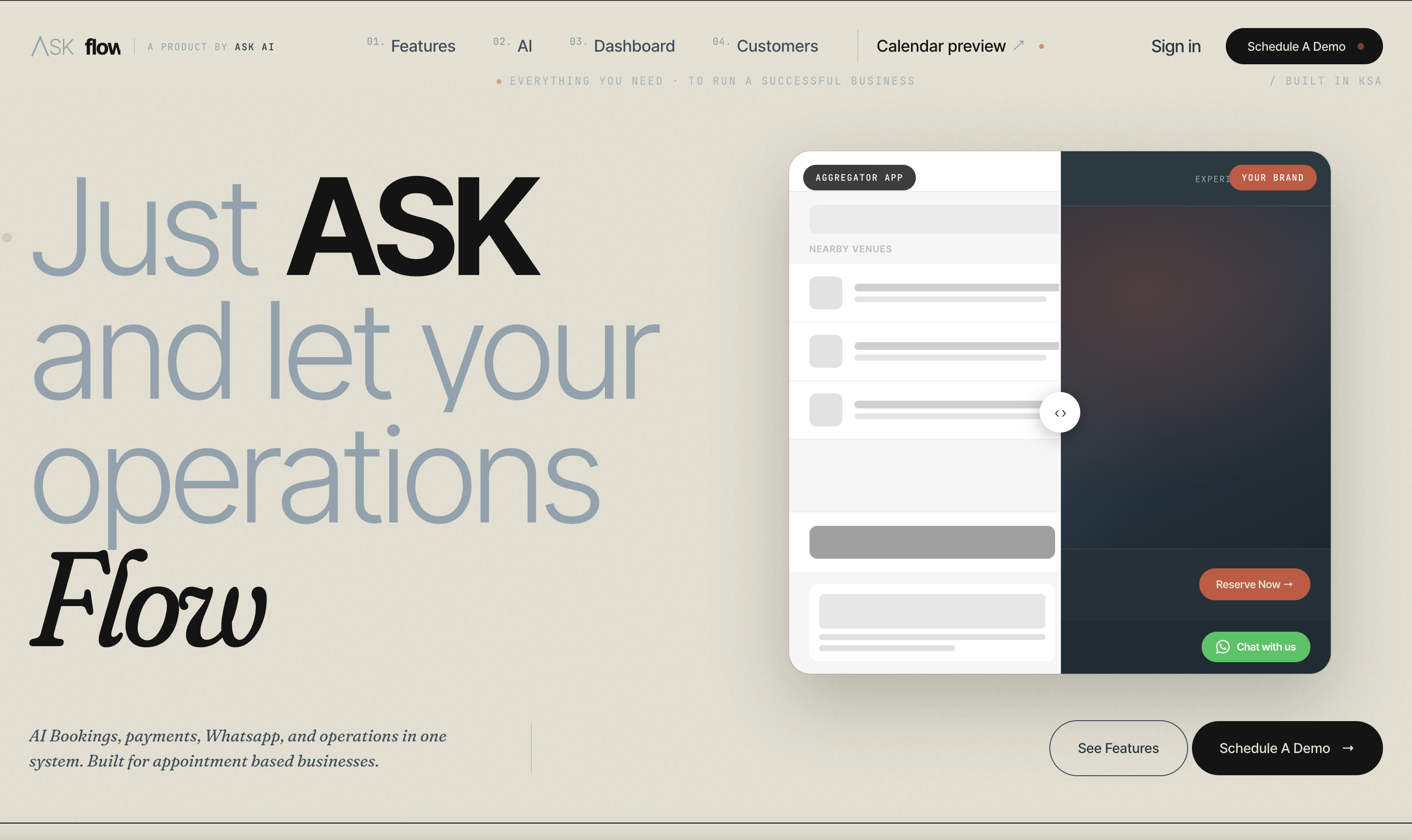 ASK Flow is a Saudi built SaaS product positioning itself as the scheduling infrastructure for appointment based businesses across the GCC. The platform unifies AI powered bookings, instant payments, WhatsApp automation, and operations into a single system. Designed from the ground up to be white labelled around each brand. The product launched with a marketing site targeting salons, clinics, studios, and service businesses.